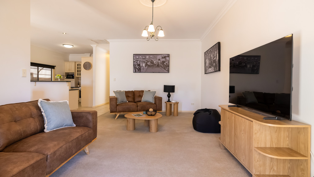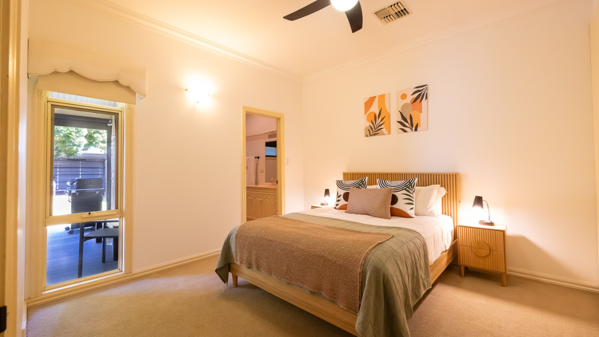 This stylish 2‑bedroom, 2‑bathroom Mildura retreat sleeps up to 7 guests and features a fully equipped kitchen, laundry, and second living room with optional extra bedding. Enjoy a private alfresco BBQ deck, enclosed front and rear yards, and a secure double lock‑up garage. Both queen bedrooms include robes, with the master offering an ensuite. Ideally located in Mildura’s CBD, the home is just a short walk to supermarkets, shops, cafés, and restaurants. Complimentary Wi‑Fi, tea and coffee, and bathroom amenities are provided, with daily servicing available on request. More than a home away from home, it’s your boutique sanctuary.