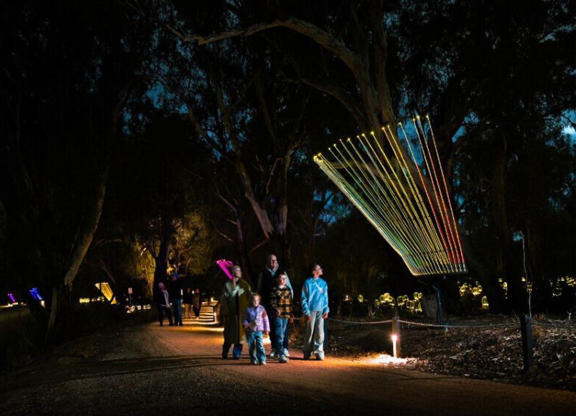 Bruce Munro, the visionary behind the iconic Field of Light at Uluru, has brought his luminous world to Mildura. Prepare to be captivated by the Trail of Lights, which illuminate Lock Island at night.
