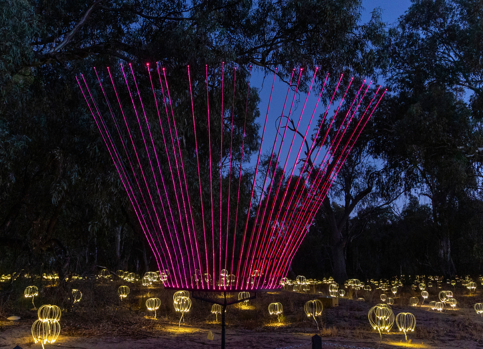 Through the interplay of 12,500 firefly lights, Gone Fishing sculptures and the natural landscape, Munro invites contemplation and reflection, creating a space for introspection and wonder.